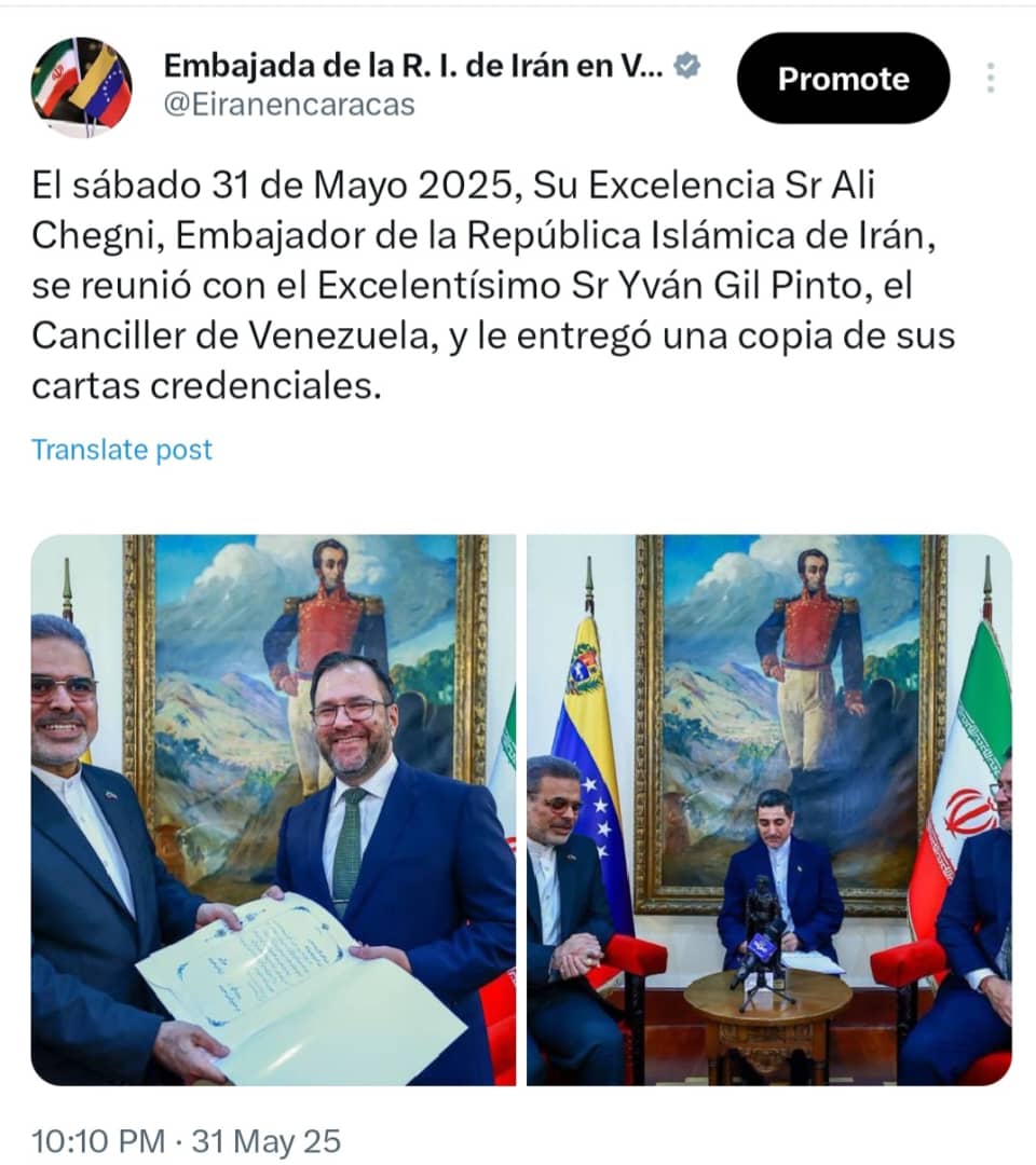روز شنبه 10 خرداد ماه سال 1404 جناب آقای دکتر چگنی سفیر  جمهوری اسلامی ایران ، ضمن ملاقات با آقای ایوان خیل، وزیر  خارجه ونزوئلا ، رونوشت استوار نامه خود را به وی تقدیم کرد.