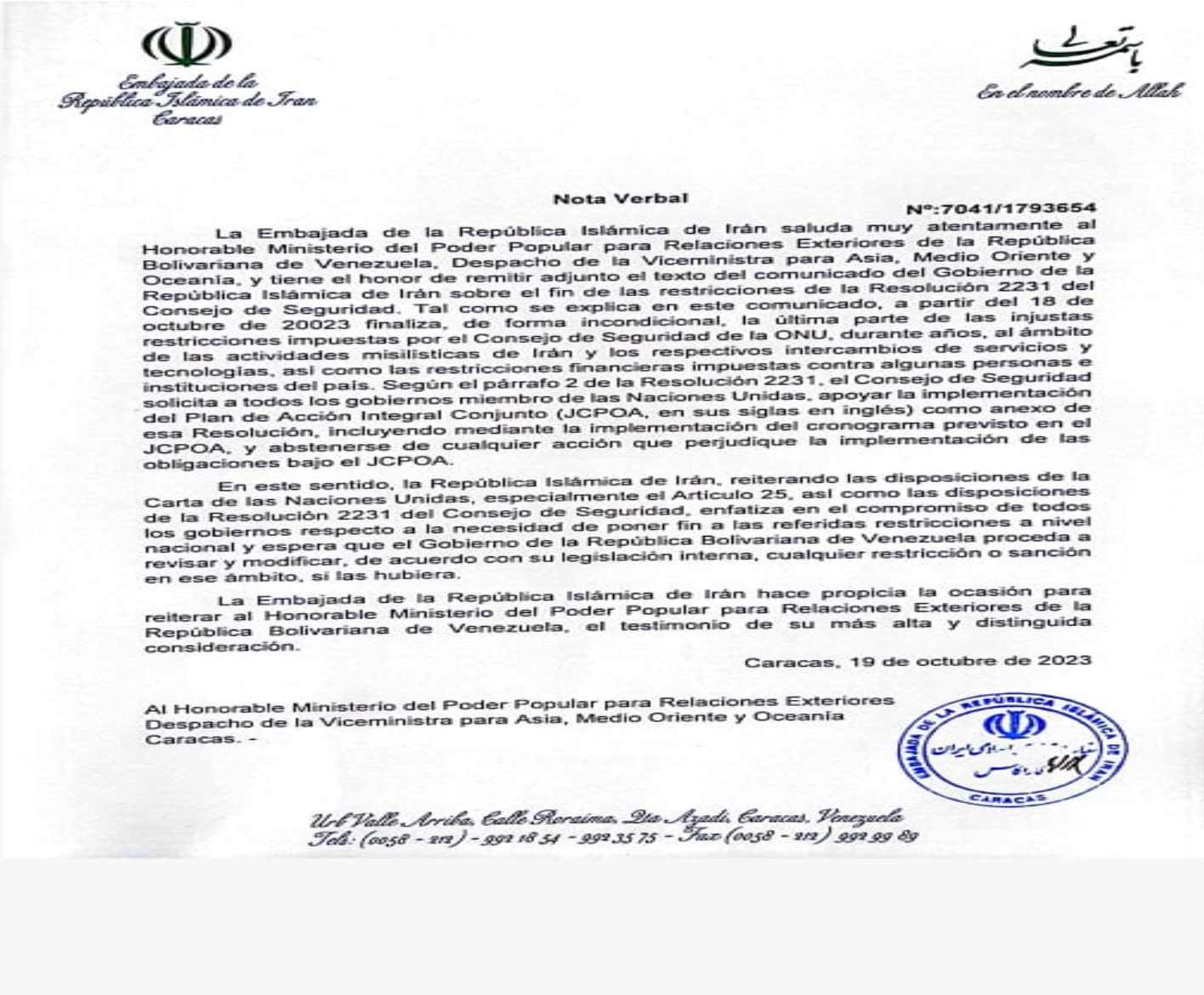 Declaración del fin de las sanciones contra Irán sobre misiles